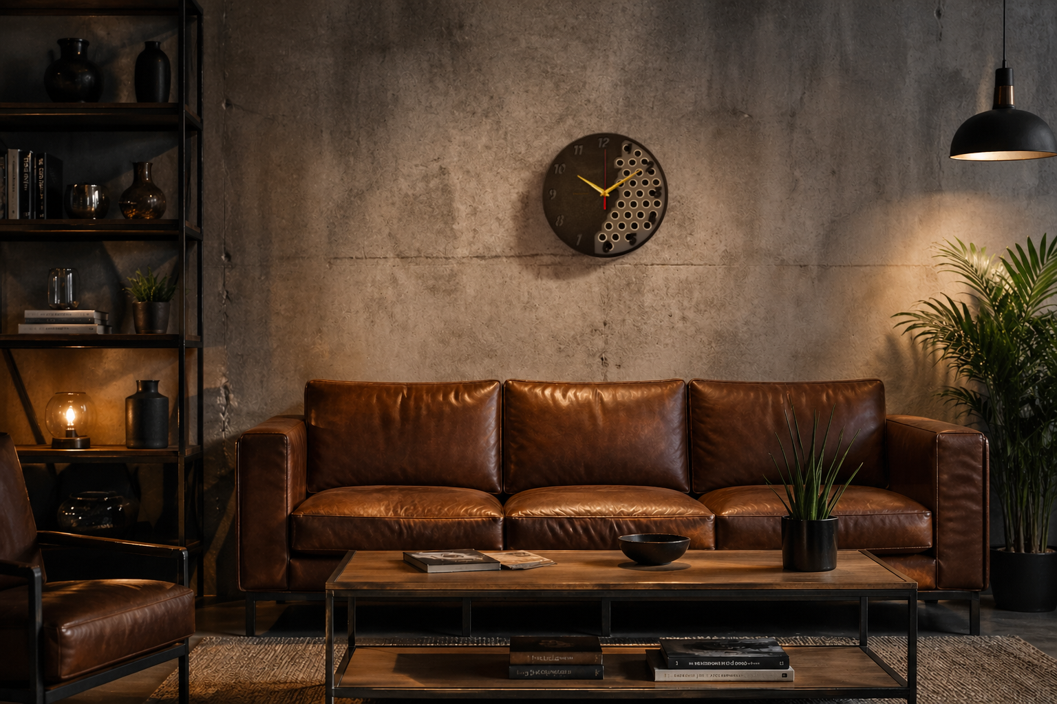 Diese stilvolle Wanduhr vereint modernes Design mit industriellen Elementen und wird garantiert zum Blickfang in deinem Zuhause. Die Kombination aus klarer, dunkler OberflĂ€che und der geometrischen Struktur auf der gegenĂŒberliegenden Seite sorgt fĂŒr einen spannenden Kontrast und eine auĂergewöhnliche Optik.