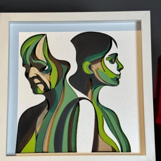 Jede einzelne Schicht wurde mit höchster Sorgfalt entworfen, gelasert und übereinandergefügt, um die zwei Lebensphasen in einem kunstvollen Motiv zu vereinen. Eingefasst in einem eleganten Holzrahmen (35 x 35 cm), ist dieses Werk bereit, deinem Zuhause Charakter und Ausdruck zu verleihen.